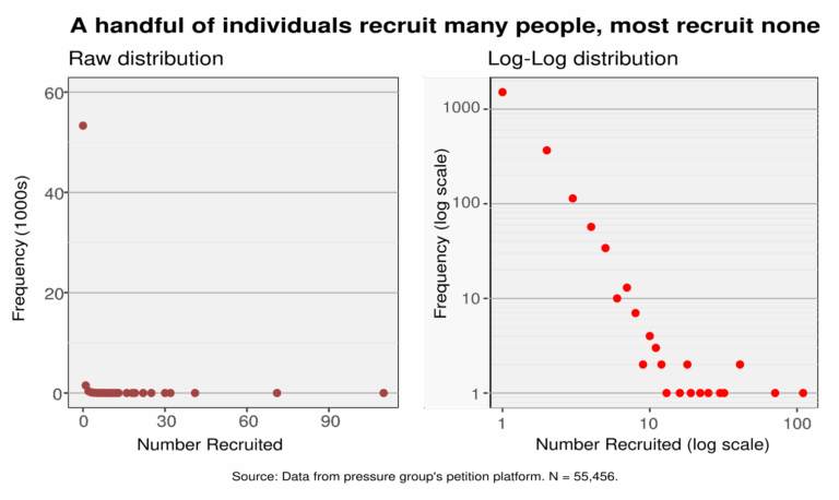 In contrast, the recruitment experiment yielded null effects. None of the recruitment messages, regardless of framing or numeric ask, significantly increased the number of new signers recruited compared to the control group. The data revealed a highly uneven distribution of recruitment activity: only 4% of participants accounted for all additional signatures generated, indicating a reliance on a small subset of “super-spreaders.” Most supporters did not recruit anyone.