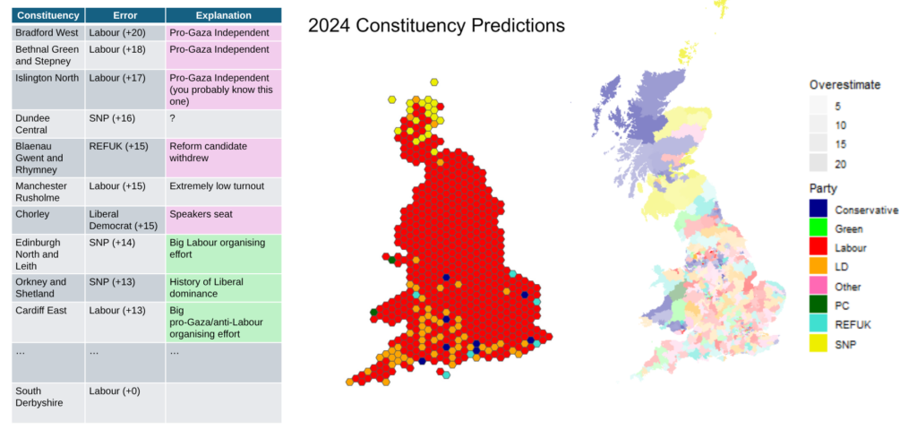 The real eye-opener came when James applied this thinking to the 2024 UK general election. By comparing his MRP model predictions to actual results, he identified constituencies with the largest “neighborhood effects”—places where something local overrode national demographic patterns.
